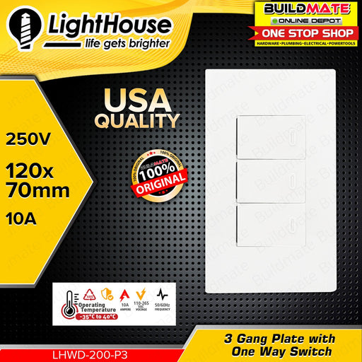 Buildmate Online DepotLIGHTHOUSE Electric 3 Gang Plate w/ One Way Switch 120mm x 70mm 250V-10A LHWD-200-P3 •BUILDMATE• PHLHSPECIFICATIONS:►3 Gang ►120mm x 70mm►250V-10A►...