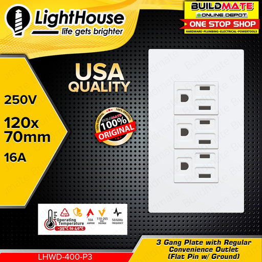Buildmate Online DepotLIGHTHOUSE Electric 3 Gang Plate w/ Regular Convenience Outlet (Flat Pin w/ Ground) LHWD-400-P3 •BUILDMATE• PHLH 100% ORIGINAL / AUTHENTIC ✔️HEAV...