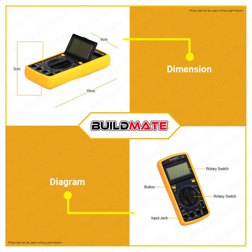 Buildmate Online DepotHoteche Digital Multimeter Tester 1000V HTC-284802 •BUILDMATE• SPECIFICATIONS: ►3 1/2 Digits LCD, Max. reading 1999 ►Low battery indication ►Overlo...