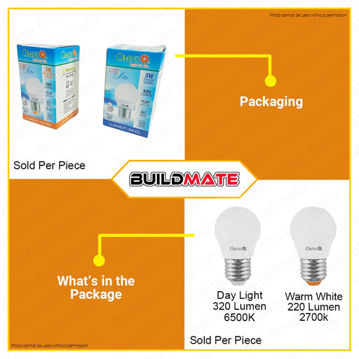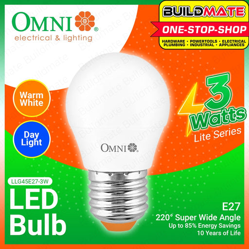 Buildmate Online DepotOMNI LED Lite Light Bulb G45 3W LLG45E27-3W •BUILDMATE• AVAILABLE IN: ►DAYLIGHT ►WARM WHITE SPECIFICATIONS: ►3W ►Model: LLG45E27-3W SPECIFICATIO...