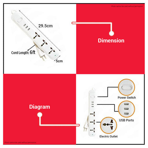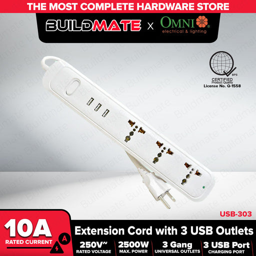 Buildmate Online DepotOMNI Travel Extension Cord with 3 USB Outlet USB-303 •BUILDMATE•SPECIFICATIONS:► 10A- 250V► Maximum Wattage: 2500W► Master on and off switch and li...