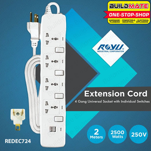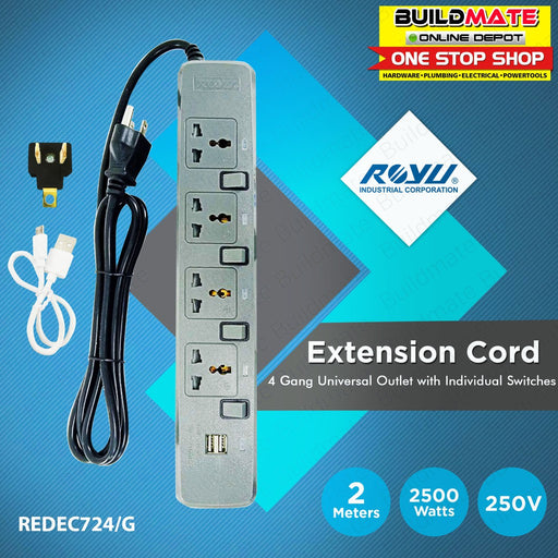 Buildmate Online DepotROYU 4 GANG Extension Cord with Individual Switches REDEC704 •BUILDMATE• SPECIFICATIONS: ►Rated Voltage: 250V ►Max. Current: 10A ►Max. Power: 2500...