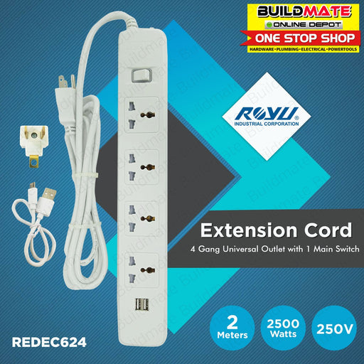 Buildmate Online DepotROYU 4 GANG Extension Cord One Main Switch & 2 USB Ports REDEC624 •BUILDMATE• SPECIFICATIONS: ►Model: REDEC624 ►2 USB Charging Port ►Cord Leng...