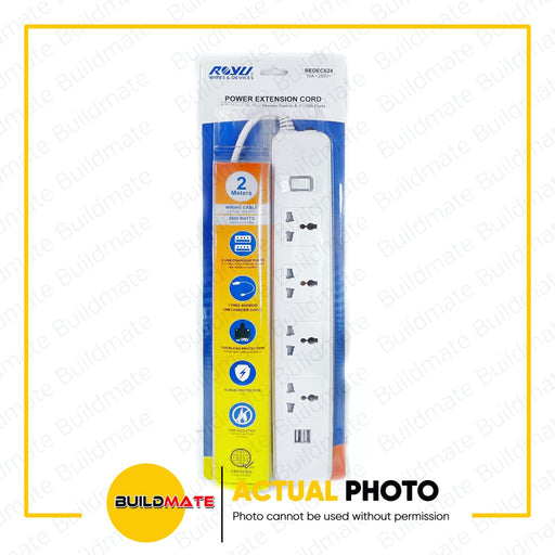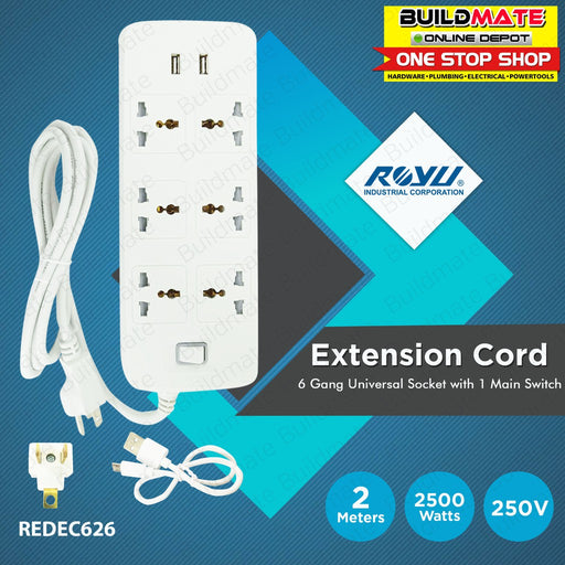 Buildmate Online DepotROYU 6 GANG Extension Cord with 1 Main Switch & 2USB Port REDEC626 •BUILDMATE• SPECIFICATIONS: ►Rated Voltage: 250V ►Max. Current: 10A ►Max. ...