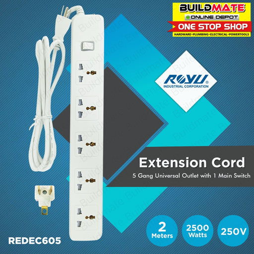 Buildmate Online DepotROYU Extension Cord with Universal Outlet REDEC613 •BUILDMATE• SPECIFICATIONS: ►Cord length: 2 Meters ►Maximum wattage: 2500 Watts ►Child protect ...