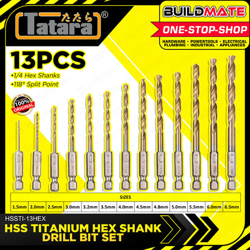 BUILDMATE 13PCS Tatara Drill Bit Set 1.5 - 6.5mm HSS Titanium Hex Shank Drill Bit for Steel Wood Titanium Twist Drill Bit Set Quick Change Drill Bit HSSTI-13HEX •