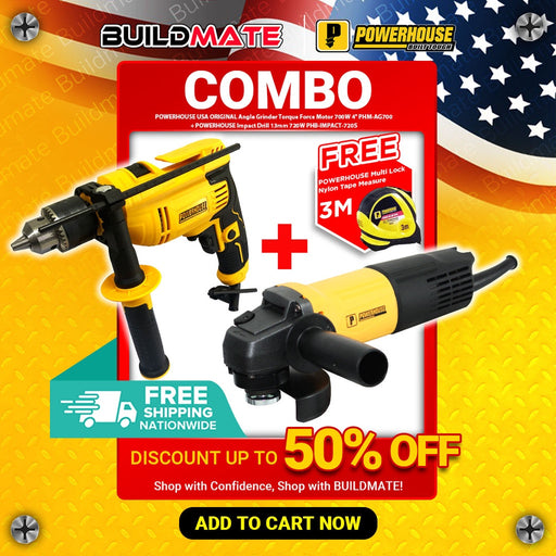 POWERHOUSE USA Angle Grinder PHM-AG700 + Impact Drill PHB-IMPACT-720S + FREE NYLON TAPE MEASURE 3M