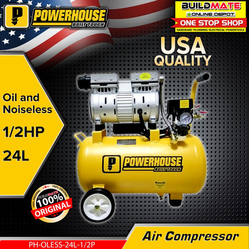 Buildmate Online DepotPOWERHOUSE Air Compressor 24L 1/2HP Oil & Noise LESS •BUILDMATE• PHPT ►Oil & Noise LESS◄ SPECIFICATIONS: ►MODEL: PH-OLESS-24L-1/2P ►M...