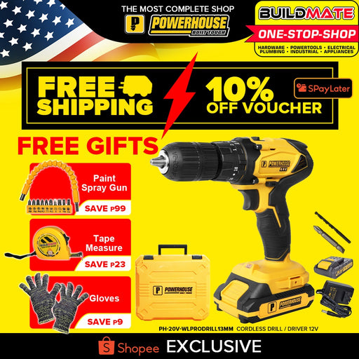 Buildmate Online DepotPOWERHOUSE Cordless Drill / Driver 20V 13mm PH-20V-CDD •BUILDMATE• PHPT SPECIFICATIONS: ►No-Load Speed: 0-400-1350RPM ►Max. Torque: 29Nm ►Chuck: 13...