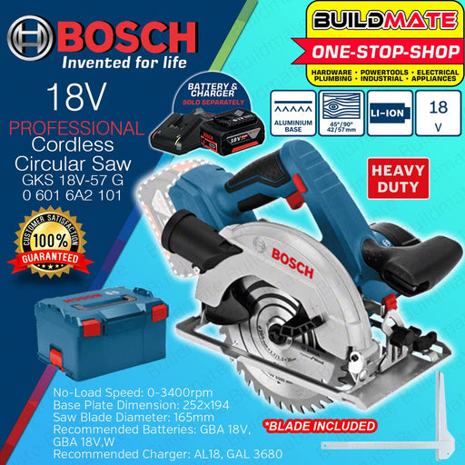 Buildmate Online DepotBOSCH Professional Lithium Ion Li-Ion Cordless Circular Saw GKS 18V-57 06016A2101 100% ORIGINAL / AUTHENTIC •BUILDMATE• SPECIFICATIONS: ►No-load s...