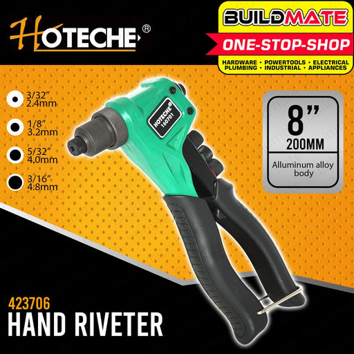 Buildmate Online DepotHOTECHE Hand Riveter 10" 250mm HTC-160101 •BUILDMATE• SPECIFICATIONS: ►Hardened steel body ►Applicable rivet: 2.4mm(3/32”), 3.2mm(1/8”), 4.0mm(5/3...