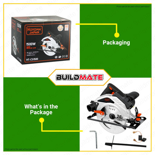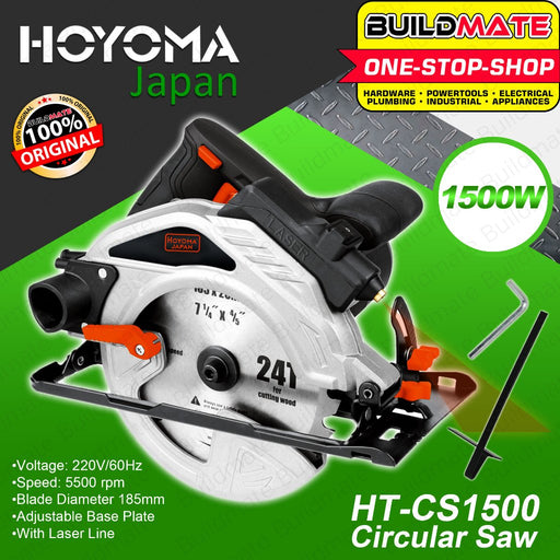 Buildmate Online DepotHOYOMA Circular Saw with Laser Line 1500W HT-CS1500 Cutting Cutter Saw Wood •BUILDMATE• HYMPT SPECIFICATIONS: ►Voltage: 220~60hz ►Input Power: 140...