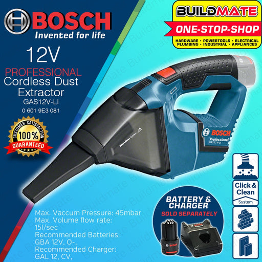 Buildmate Online DepotBOSCH Professional Handheld Cordless Lithium Ion Li-Ion Battery Vacuum Cleaner GAS 12V 06019E3081 SPECIFICATIONS: ►Battery voltage: 12 V ►Weight e...