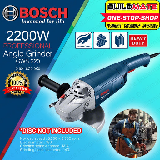 Buildmate Online DepotBOSCH Heavy Duty Large Angle Grinder 2200W M14 With Handle GWS2200-180H 06018C00K0 | 100% ORIGINAL / AUTHENTIC •BUILDMATE• BPT SPECIFICATIONS: ►Mo...