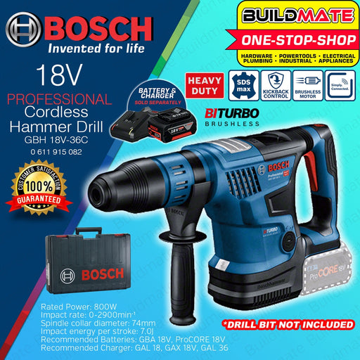 Buildmate Online DepotBOSCH Professional Cordless Lithium Ion Li-Ion Hammer Drill with Case GBH 18V-36C 0611915082 SPECIFICATIONS: ►Battery voltage: 18 V ►Max. impact ...