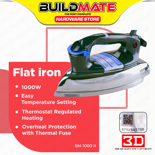 Buildmate Online DepotBUILDMATE 3D Electric Flat Iron 1000W SM-1000 II with Thermostat Regulated Heating and Aluminum Sole Plate Handheld Dry Iron SM-1000 II SPECIFICATI...