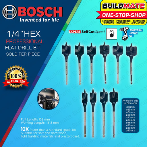 Buildmate Online DepotBUILDMATE Bosch 152MM Self Cut Speed Flat Wood Spade Drill Bit 1/4" Hex Shank Drilling 24MM - 40MM - BAX AVAILABLE IN: ►18MM - 2608595489 ►22MM - ...