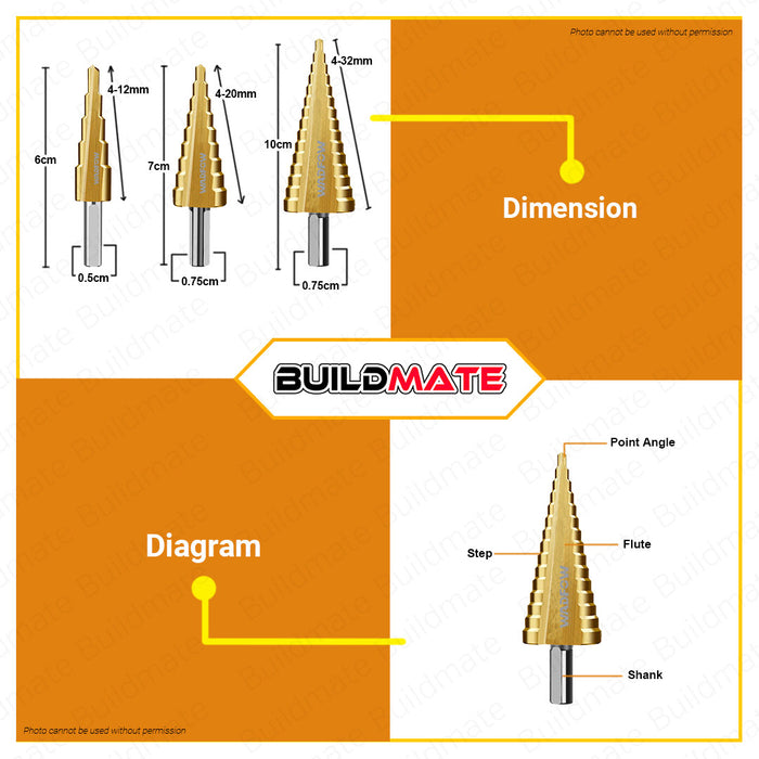 BUILDMATE Wadfow Step Drill Bit 4-12mm | 4-20mm | 4-32mm [SOLD PER PIECE] Hexagonal Shank Step Cone Drill Bit Hole Groove Cutter Titanium Coated Step Drill Metal Hex Core Drill Bits High Speed Steel Step Drill Bit Cone Hole Cutter • WHT