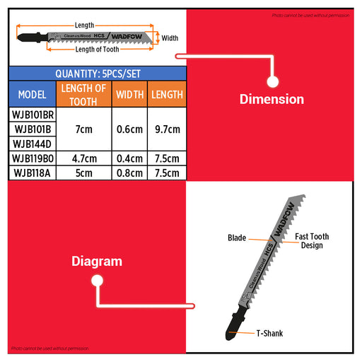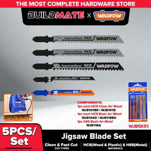 Buildmate Online DepotNo reviewsWADFOW 5pcs/set Mixed Jigsaw Blade Clean Cut Jig Saw Blade for Cordless Tools WJB5K51 WHT SPECIFICATIONS:► Model: WJB5K51► Mixed Jigsaw Blades► Set...