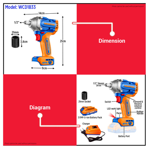 Buildmate Online DepotNo reviewsWADFOW Cordless Impact Wrench WCD1B33 WCPT SPECIFICATIONS:- Model: WCD1B33- Motor: Brushless- Voltage: 20V- Drive Size: 1/2" square drive- No-Load ...