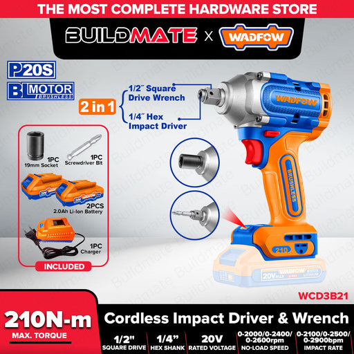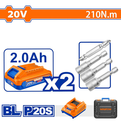 WADFOW 2in1 P20S/20V Lithium-Ion Brushless Motor Cordless Impact Driver & Impact Wrench WCD3B21 WCPT