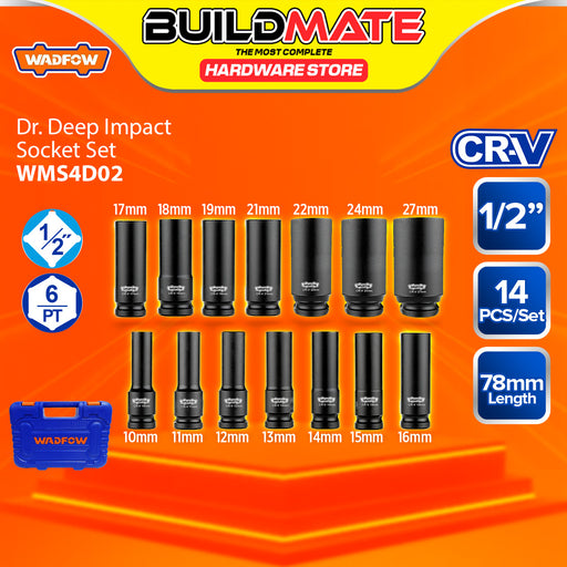 Buildmate Online DepotNo reviewsBUILDMATE Wadfow 14pcs 1/2" Dr. Deep Impact Socket Set WMS4D02 - WHT SPECIFICATION:Model: WMS4D0214pcs 1/2" deep impact socket setSize: 10, 11, 12...
