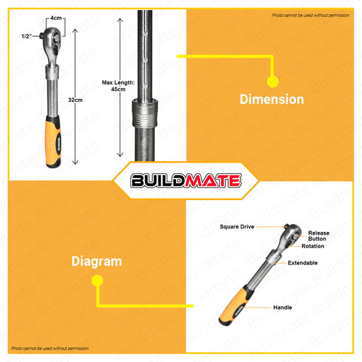 Buildmate Online DepotBUILDMATE Ingco Extendable Ratchet Wrench 1/2" Inch 72T Reversible Ratchet Socket Wrench Repair Tools Adjustable Wrench Automotive Tool Multi-purpo...