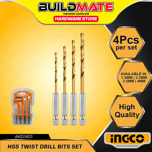 BUILDMATE Ingco 4pcs 1/4" Hex Fully Ground HSS Twist Drill Bits Set Titanium Coated Metal Wood Plastic Drilling Multi-Purpose Power Tool Accessories AKD1401 - IHT