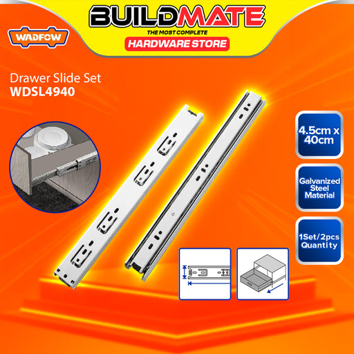 Buildmate Online DepotNo reviewsBUILDMATE Wadfow Drawer Slide Set Heavy-duty slide rails WDSL4940 - WHT SPECIFICATION:►Model: WDSL4940►1Set/2pcs►Full extension, ball bearing drawe...