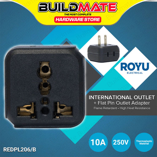 Buildmate Online DepotBUILDMATE Royu International Outlet + 2 Flat Pin Outlet Adapter White / Black All-in-One Universal Socket Travel Power Outlet Converter Plug Adapto...