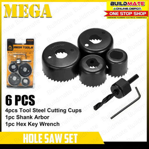 Buildmate Online DepotPROMAN / MEGA Hole Saw 6PCS SET SOLD PER SET •BUILDMATE•AVAILABLE IN:►PROMAN-RR-551►MEGA-MHS06SPECIFICATIONS FOR MEGA:►4pcs Tool Steel Cutting Cups...