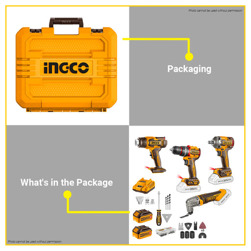BUILDMATE Ingco 4pcs Cordless Combo Kit Brushless Impact Drill w/ Impact Wrench, Heat Gun & Multi-Tool Power Tool Combo Set COSLI240969 - ICPT