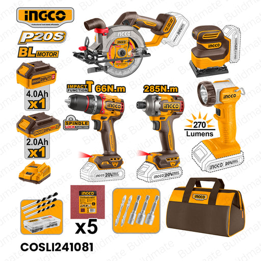 BUILDMATE Ingco 5pcs 20V Cordless Combo Kit Brushless Impact Drill w/ Circular Saw, Impact Driver, Sheet Sander & Work Lamp Power Tool Combo Set COSLI241081 - ICPT