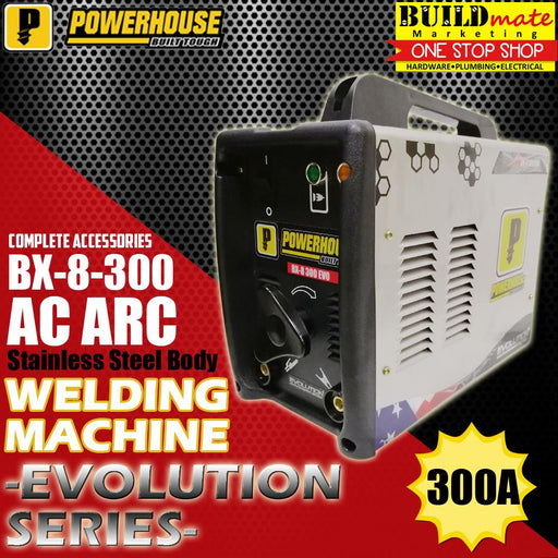 Buildmate Online DepotPOWERHOUSE 300A BX-8300 EVOLUTION AC ARC STAINLESS Body Welding Machine •BUILDMATE• SPECIFICATIONS: ►Rated Input Voltage: 220V ►Frequency: 60hz ►N...