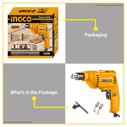BUILDMATE Ingco 450W Electric Drill 6.5MM with Variable Speed Control Rotary Drilling Power Tools ED45658 - IPT
