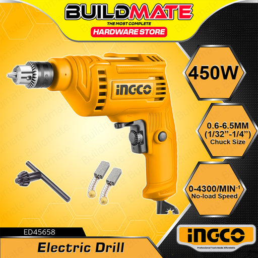 Buildmate Online DepotBUILDMATE Ingco 450W Electric Drill 6.5MM with Variable Speed Control Rotary Drilling Power Tools ED45658 - IPTSPECIFICATION:►Model: ED45658►Voltag...
