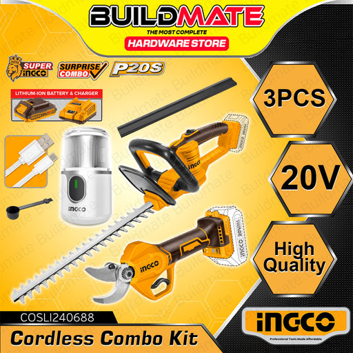 BUILDMATE Ingco 3pcs Cordless Combo Kit 20V Lithium-Ion Hedge Trimmer with Gauge Straight Shear & 90W Cordless Coffee Grinder Combo Tool Set COSLI240688 - ICPT