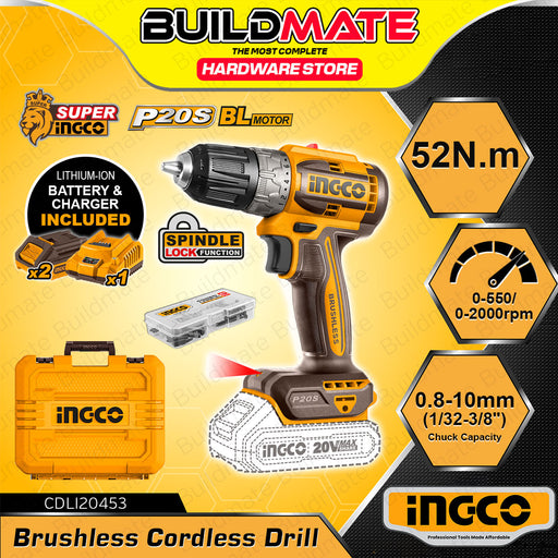 BUILDMATE Ingco Lithium-Ion 20V Brushless Cordless Drill 53N.m Rechargeable Drill Driver Power Tools CDLI20453 / CDLI204531 - ICPT