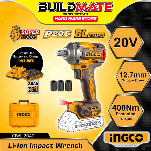 BUILDMATE Ingco Lithium-Ion Brushless Cordless 20V Impact Wrench 400N.m Rechargeable Automotive Torque Wrench Driver - ICPT