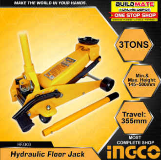 Buildmate Online DepotINGCO Hydraulic Floor Jack 3 TONS HFJ303 •BUILDMATE• IHT SPECIFICATIONS: ►3 TONS ►Min. height: 145mm ►Max. height: 500mm ►Travel: 355mm ►Net weigh...