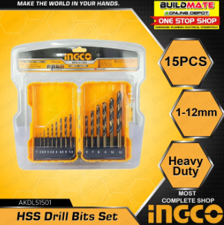 Buildmate Online DepotINGCO HSS Drill Bits Set 15PCS/SET AKDL51501 •BUILDMATE• IHT SPECIFICATIONS: ►15pcs HSS drill bits set ►Size 1 ,2 ,2.5 ,3 ,3.5 ,4, 4.5, 5, 5.5, 6,...