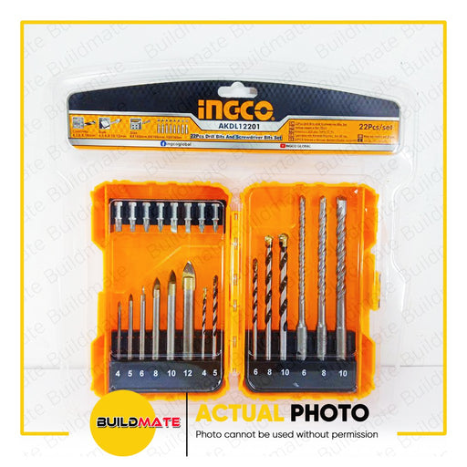 Buildmate Online DepotINGCO 22PCS Drill Bits and Screwdriver Bits SET AKDL12201 •BUILDMATE• IHT SPECIFICATIONS: 8pcs 25mm screwdriver bits set 6pcs glass drill bits 4,5...