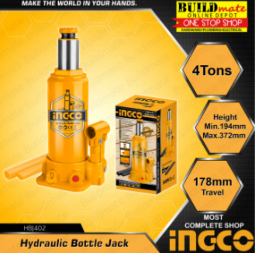 Buildmate Online DepotINGCO Hydraulic Bottle Jack 4 TONS HBJ402 •BUILDMATE• SPECIFICATIONS: ►4Ton With safety valve ►Min. height: 194mm ►Max. height: 372mm ►Travel:178...