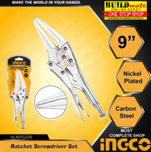 Buildmate Online DepotINGCO9" Long Nose Locking Pliers HLNP0209! •BUILDMATE• IHT SPECIFICATIONS: Carbon Steel Size:9"" HRC38°-HRC48° Nickel plated