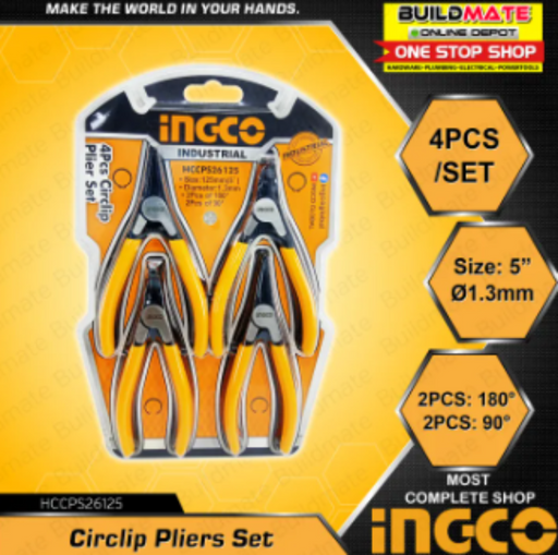 Buildmate Online DepotINGCO 4PCS Circlip Pliers Set HCCPS26125 •BUILDMATE• IHT SPECIFICATIONS: 4Pcs Circlip Plier Set 2pcs of 180° 2pcs of 90° Size:5"/150mm Diameter:1....