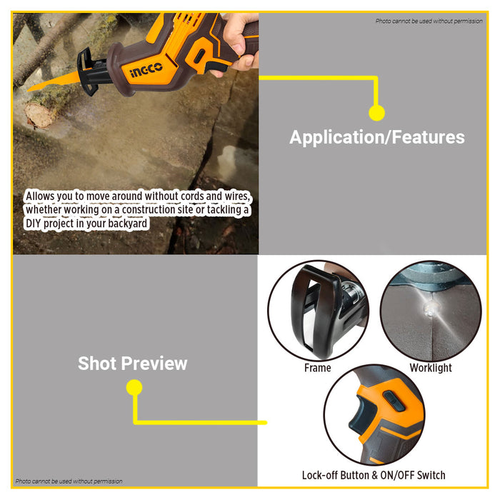 BUILDMATE Ingco Lithium-Ion Reciprocating Saw 20V Rechargeable Metal Wood Sabre Saw with 15mm Stroke Length - ICPT