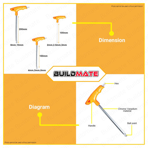 INGCO T-Handle Ball Point Hex Wrench Set 8 PCS/SET HHKT80828 100% ORIGINAL / AUTHENTIC •BUILDMATE• IHT SPECIFICATIONS: ►8 pcs T-handle ball point ...