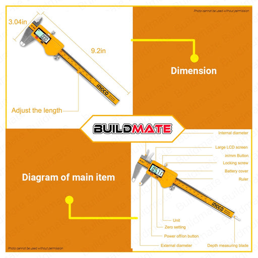 INGCO Digital Caliper 150mm HDCD28150 •BUILDMATE• IHT SPECIFICATIONS: ►Measuring model: internal diameter, external diameter, depth and step measu...