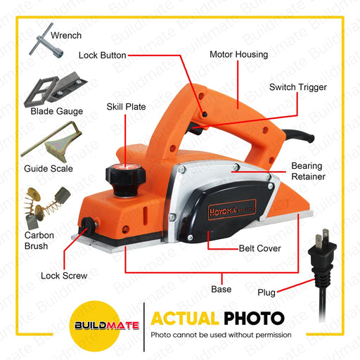 Buildmate Online DepotHOYOMA JAPAN 650W Electric Wood Planer HT-EP650 •BUILDMATE• HYMPTT SPECIFICATIONS: ►Rated Input Power: 650W ►Rated Voltage: 220V/60Hz ►No-Load Spe...