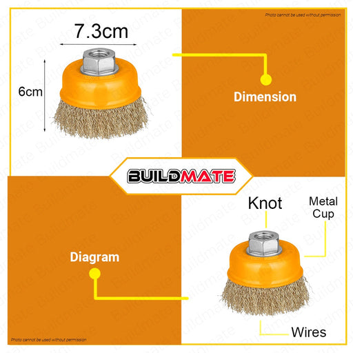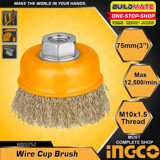 Buildmate Online DepotINGCO Cup Wire Brush With Nut for Angle Grinder 75mm 3" WB10752 •BUILDMATE• HT2 SPECIFICATIONS: ►Size: 75mm 3" ►Wire diameter: 0.3mm ►M10 x 1.5 De...